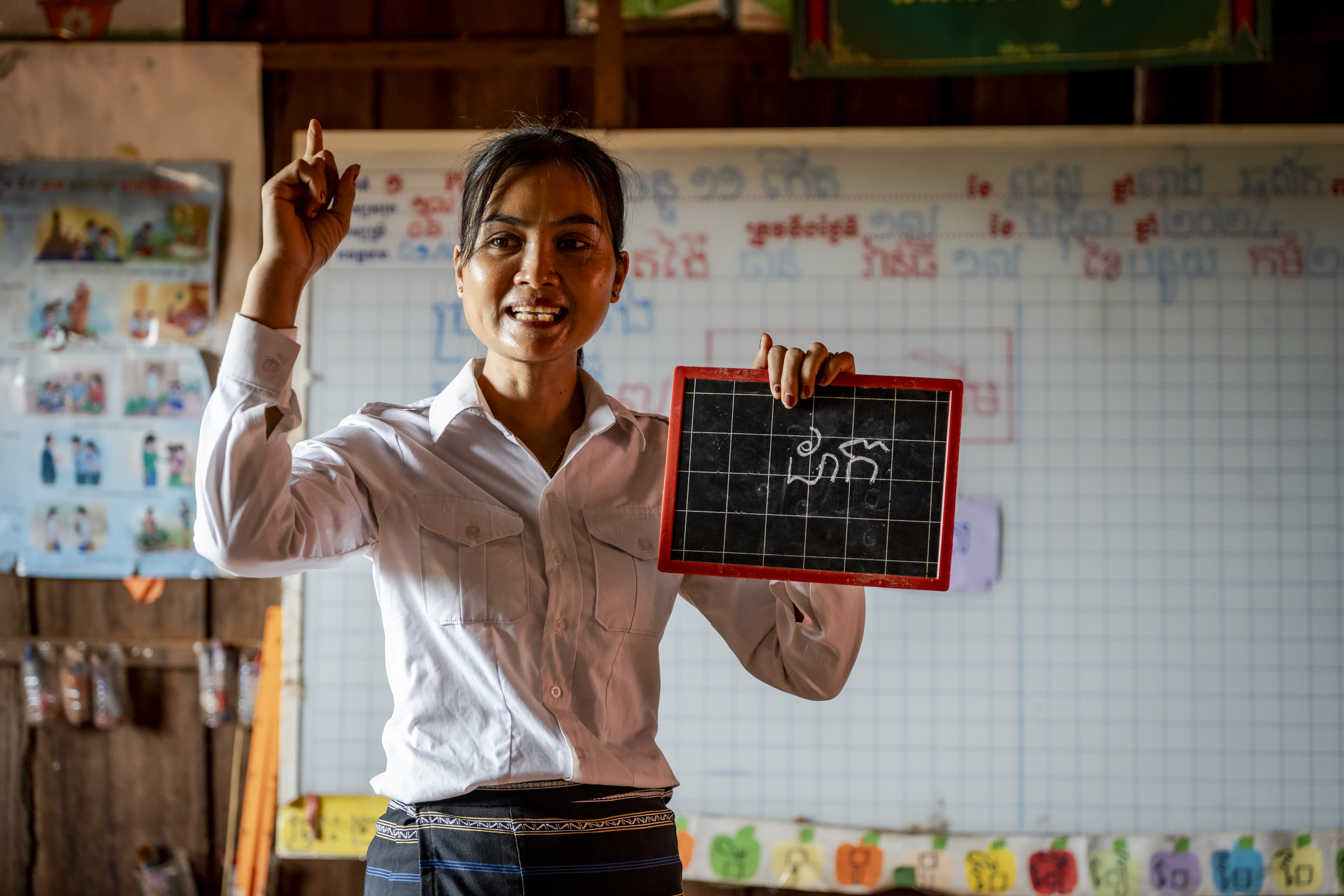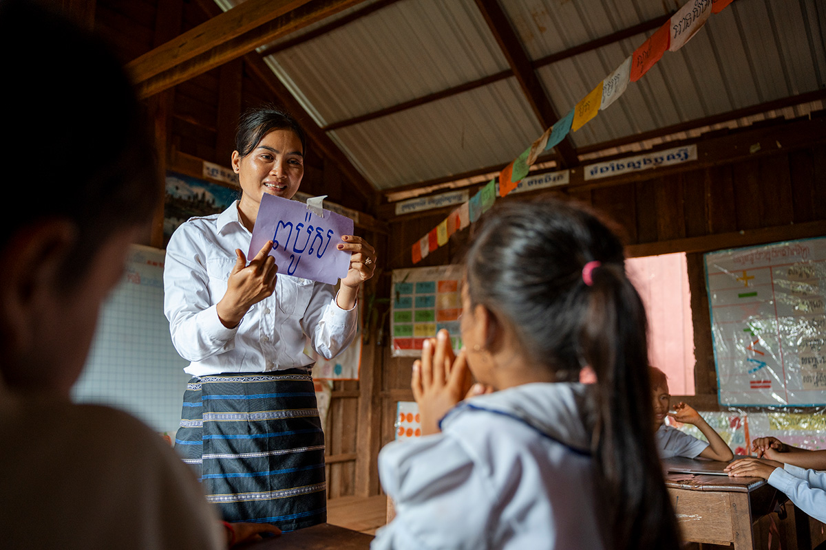 Skilled with both Khmer and Kreung languages in combination with her teaching methods, her first graders enjoy dictation exercise as she flipped colorful word cards on the white board. Ngang Bos walks around and guides her newest student sitting at the back who is trying to learn along with her peers.