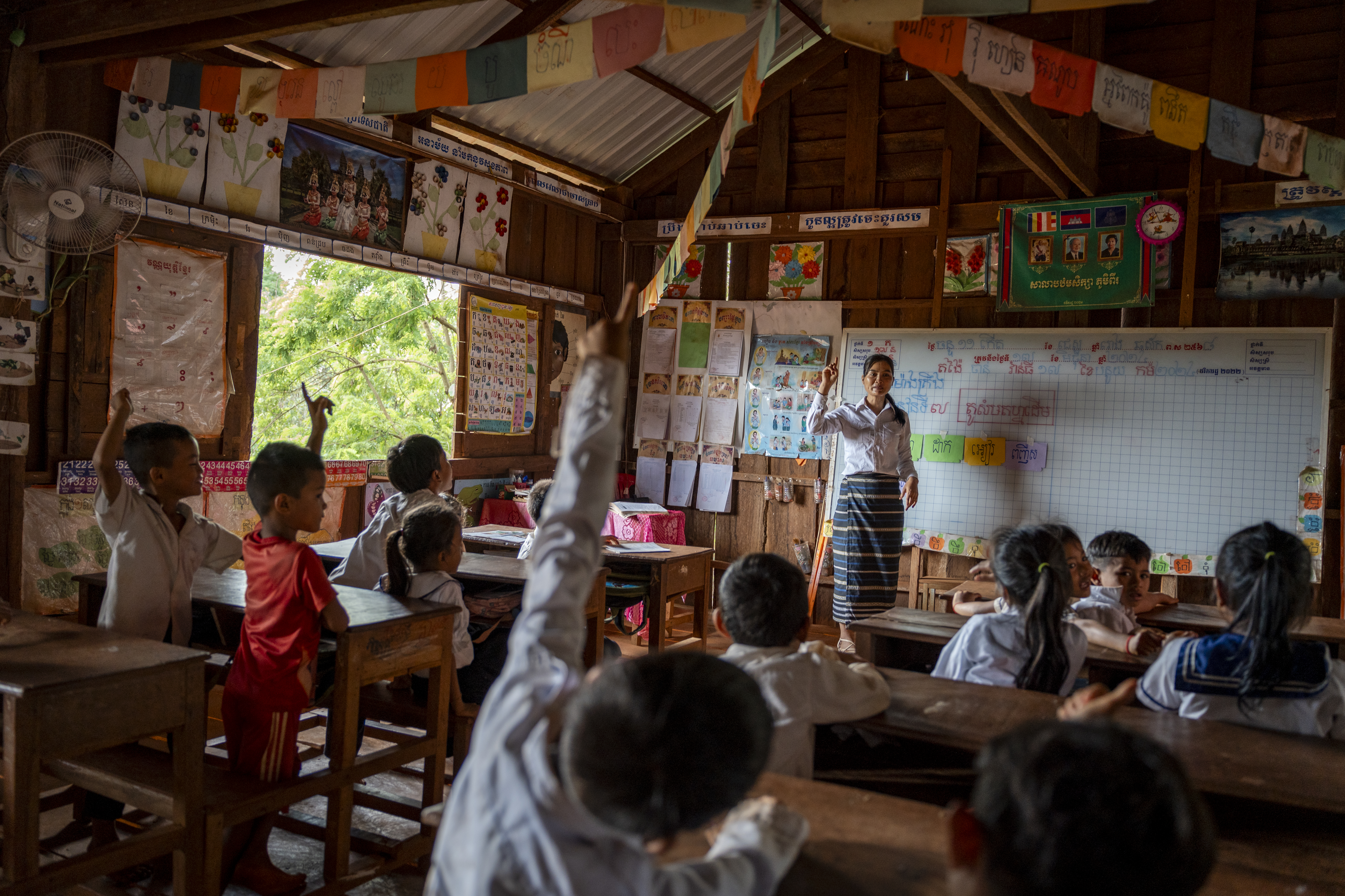 In golden and blue, a 33-year-old Multilingual Education (MLE) teacher highlight her traditional clothing as she teaches her first graders in Phum Pi Primary school. The three-classrooms wooden school has been standing strongly since 2007 as an educational home to hundreds of students. Since the school’s establishment, Ngang Bos has been a Kreung Multilingual Education teacher starting early as the community teacher